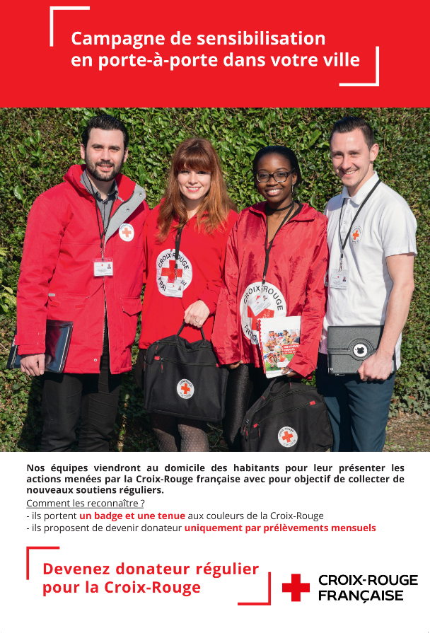 Mandatée par la Croix-Rouge française, notre équipe sera clairement identifiable par un badge et des vêtements aux couleurs de l’association [...] "
